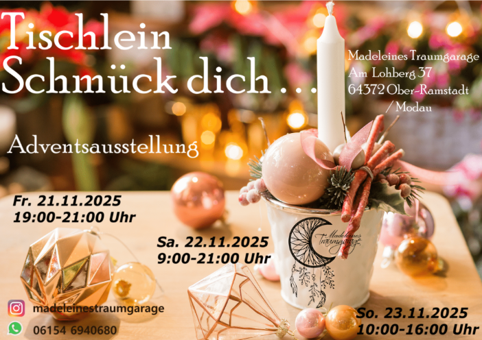 Madeleines Traumgarage Aktuelles: Adventsausstellung in der Traumgaragevom 21.11-23.11.2025 sind wir wie jedes Jahr das ganze Wochenende für Euch da.Natürlich gibt es wieder leckere Waffeln, Glühwein und Punch für die Kinder Selbstbedienungsschränkchen Eine Kleinigkeit für Zwischendurchoder ein kurzfristiges Geschenkkein Problem, hier könnt Ihr zu jeder Tages- oder Nachtzeit noch schnell und unkompliziert eine Kleinigkeit besorgenimmer aktuell und immer frisch gefüllt direkt neben der Traumgarage Online Bestellen → abholen oder Liefern lassen zum Online-Shop Kostenlos:Modau, Ernsthofen & Frankenhausen7,50 €:Ober-Ramstadt, Rohrbach, Neutsch, Herchenrode, Hoxhol, Wembach10,00 €:Asbach, Brandau, Hahn, Nieder-Beerbach, Waschenbach, Webern Öffnungszeiten:Montag: RuhetagDienstag: 9:00 – 12:00 UhrMittwoch-Freitag: 9:00 – 12:00 Uhr 15:00 – 18:00 UhrSamstag: 9:00 – 12:00 Uhrnach Absprache ist eine Bedienung außerhalb der regulären Öffnungszeiten möglich